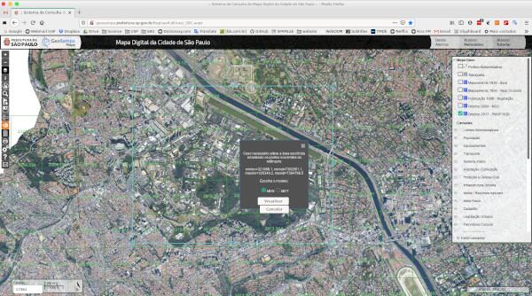 First, head to http://geosampa.prefeitura.sp.gov.br. The city limits will be displayed in the center, with a base map showing the limits of the neighboring cities and the districts of São Paulo in a thicker outline. The menu panel on the right side has the available layers, and the toolbar on the left has, well, the tools to navigate, query, etc.