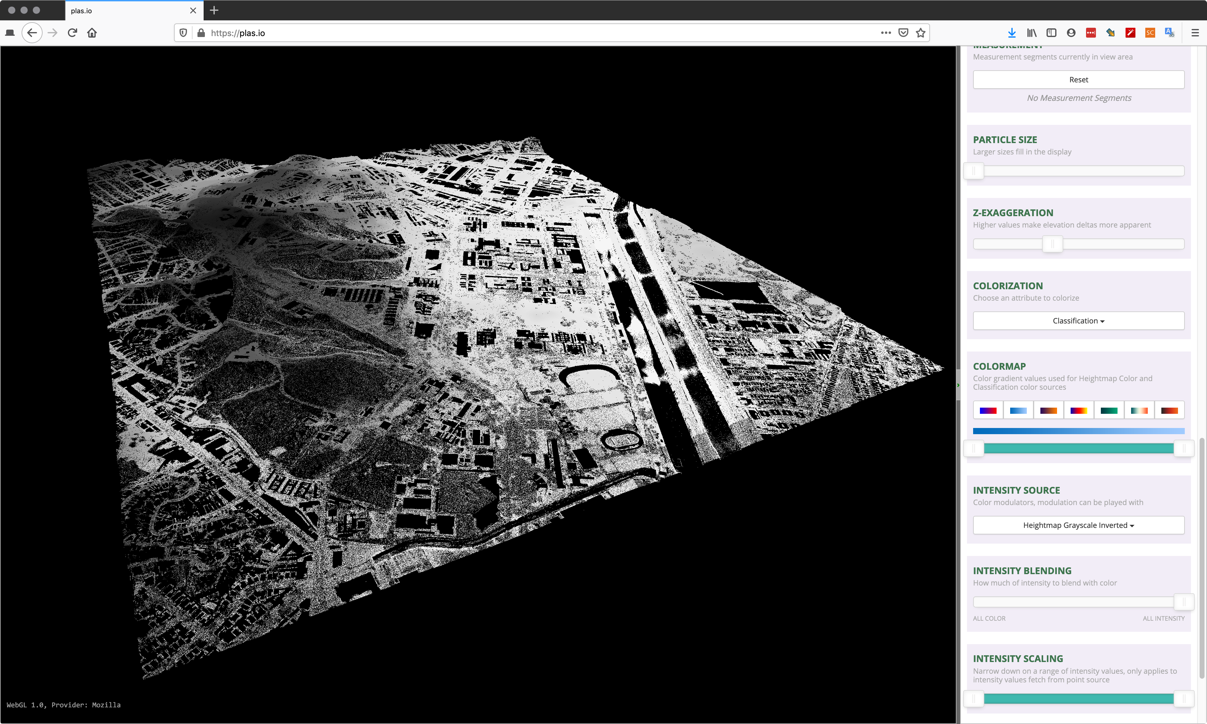 For this example I downloaded some 30 tiles and merged then into one file. Below you can see the whole thing displayed in Plas.io.